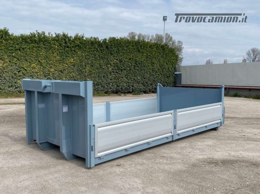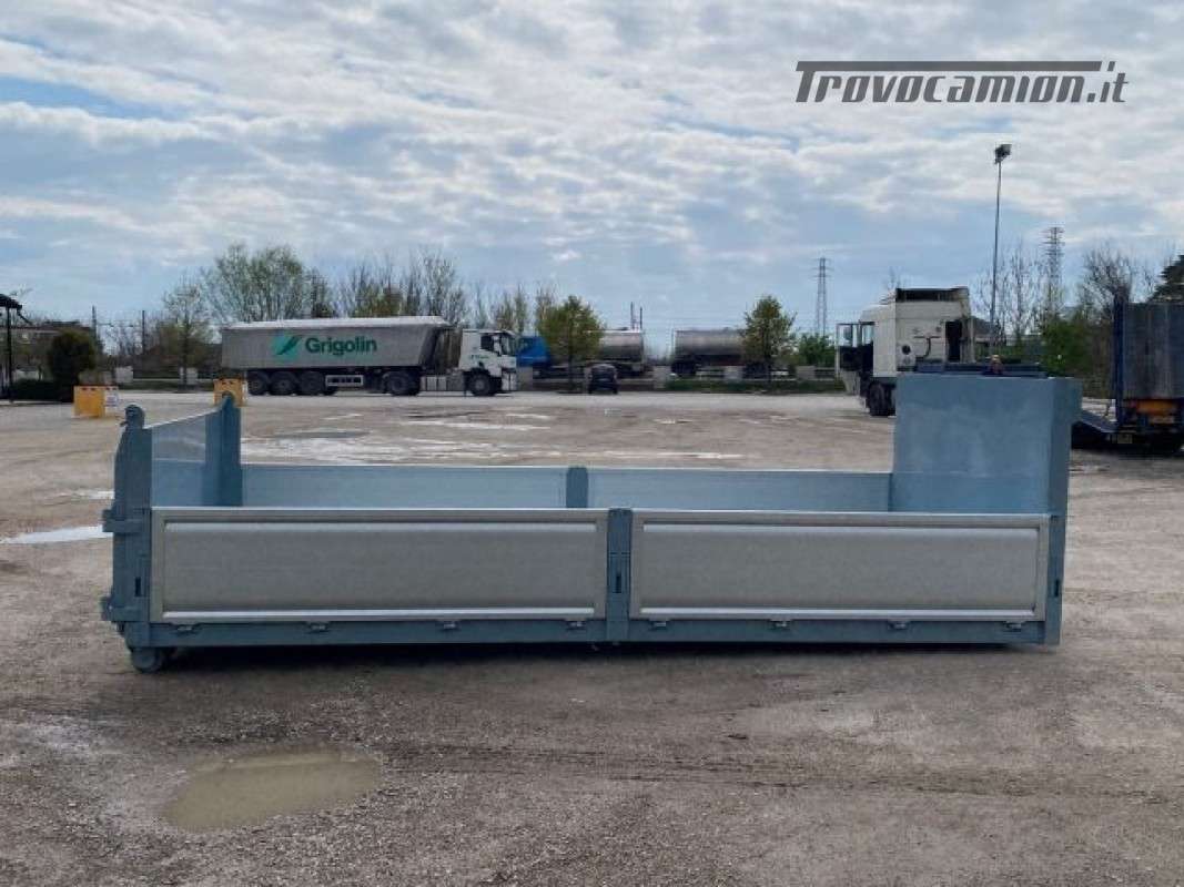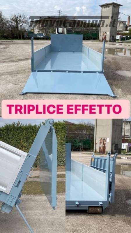 TITOLO: CONTAINER NUOVO A PIANALE CON PIANTONI RIMOVIBILI IN FERRO E DUE SPONDE PER LATO IN TR5 E SPONDA POSTERIORE IN FERRO A 3 EFFETTI A LIBRO, RIBALTABILE VERSO L’ALTO E RIBALTABILE VERSO IL BASSO CON TRAVI IN APPOGGIO DA 200 MM